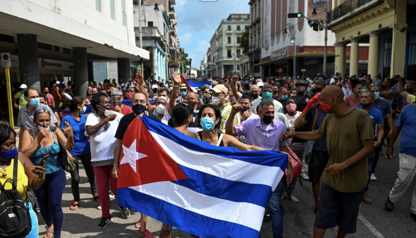 Group of people protesting in solidarity with Cuba